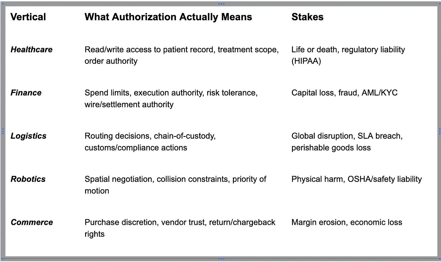 These layers matter because the consequences of agentic action vary dramatically across verticals. A medical agent can’t share a permission model with a supply chain agent. A retail shopping agent can’t govern itself like a trading agent. The grammar will be shared. The underlying protocols will be standardized, but regulation, risk tolerance, and permissions will be vertical-specific.